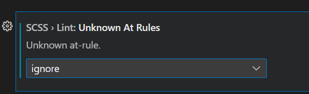 이럴 땐, vscode 설정 창을 열고 (단축키: ctrl + , ) unknown으로 검색하면 "Unknown At Rules" 항목을 "warning"에서 "ignore"로 변경해주면 됩니다. CSS와 SCSS가 따로 설정되므로 둘 다 ignore로 변경해주면 됩니다.