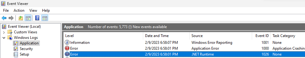우선 Event Log Viewer 에서 Exception 메세지를 먼저 확인 합니다.