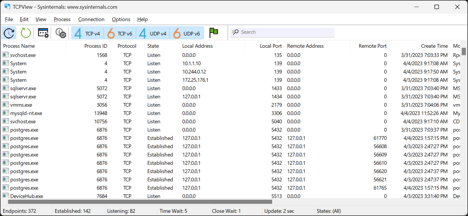 이럴 때 마이크로 소프트에서 공식 제공하는 TcpView GUI 툴을 사용하면 쉽게 확인 할 수 있습니다.