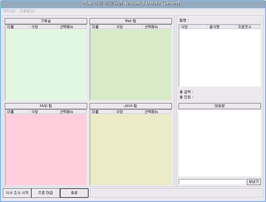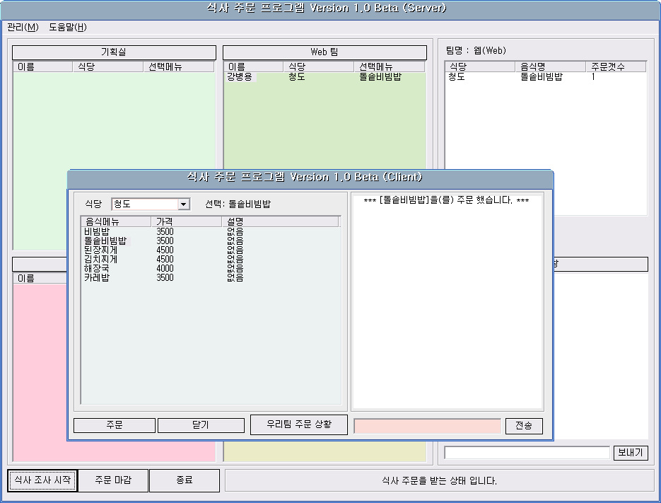 * 서버에서 식사주문을 요청하면 서버에 접속 되어 있는 직원들이 식사 주문을 하게되고 각 팀별로 집계되어 서버 프로그램에 보여지게된다. 식사 주문시 팀원끼리 채팅도 지원한다. 서버에서 주문 마감 버튼을 누르면 주문이 마감된다.