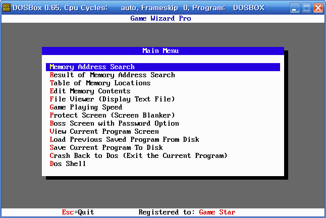 GW.EXE를 실행하면 Game Wizard가 RAM에 상주하게 되고, 게임을 실행하신 후 틸드(~)키를 누르시면 아래 보이는Game Wizard 화면으로 전환됩니다. 여기서 다시 ESC를 누르시면 원래 게임 진행 화면으로 전환됩니다.