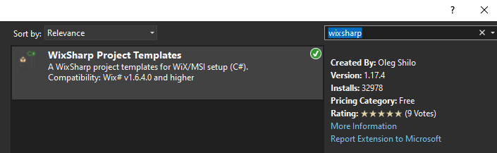 WixSharp을 사용하기 위해서 Visual Sutdio 2022 - Extensions 메뉴 => Manage Extensions 창을 열고 wixsharp으로 검색한 다음 WixSharp Project Templates를 설치해 줍니다.