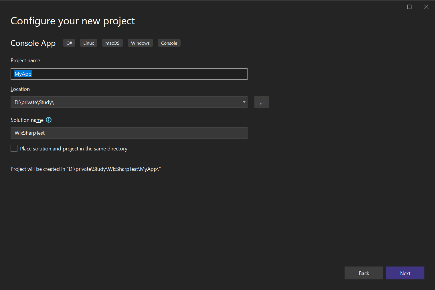 우선 WixSharpTest 라는 솔루션과 MyApp 콘솔 어플리케이션 프로젝트를 하나 생성합니다.