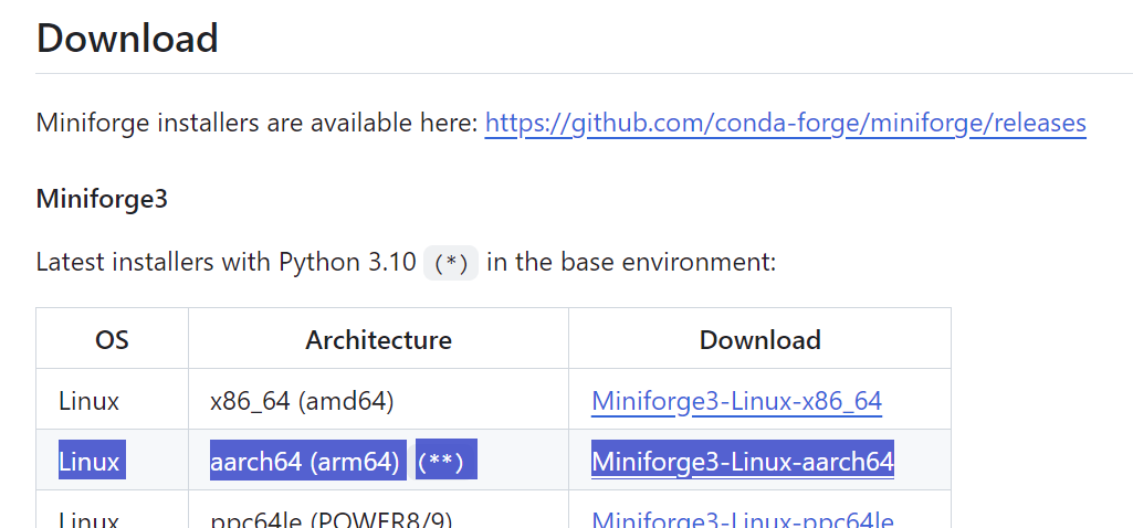 이곳에 가면 Miniforge3-Linux-aarch64 다운로드 링크가 있습니다.