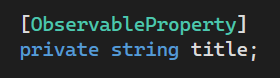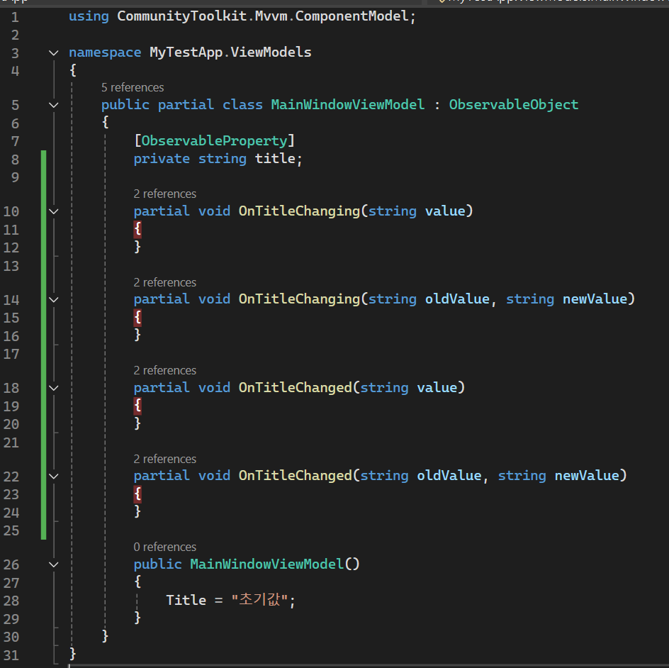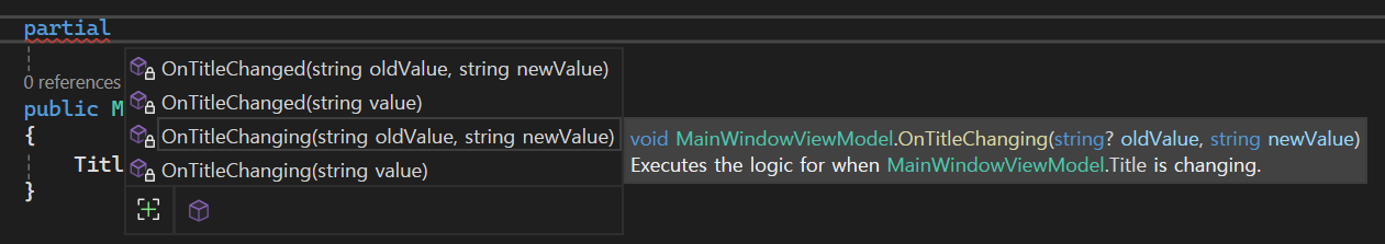함수의 Naming convention은 On[멤버변수이름]Changing/Changed 형태로 ObservableProperty attribute가 붙은 member 변수에 대해 자동으로 코드가 생성됩니다. Changing의 경우 해당 변수가 binding된 뷰의 컨트롤에서 변경된 값이 value 인자로 넘어오지만 아직 Title 변수의 setter가 호출되기 이전에 호출되는 callback 함수 입니다. Changed의 경우 Title의 값이 바뀐 다음 호출됩니다.
