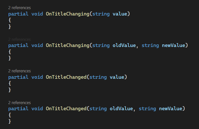 ObservableProperty attribute가 선언되면 getter 및 PropertyChanged 이벤트를 호출하는 setter 코드 외에 추가적으로 아래 callback 함수들이 code generator에 의해 자동으로 생성됩니다.